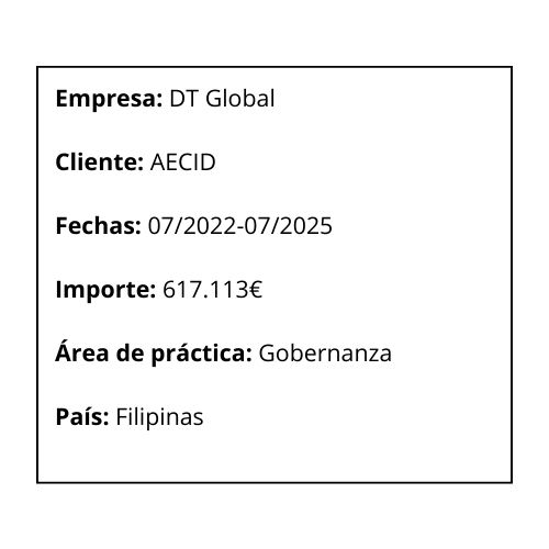 La asistencia técnica al proyecto GO JUST II ejecutada en solitario por DT Global cubre la totalidad del segundo componente del programa GOJUST II, dedicado a la promoción y protección de los derechos humanos en la sociedad filipina. La AT proporcionará las tan necesarias mejoras en las capacidades y aptitudes de la Comisión Filipina de Derechos Humanos (CHR) basadas en sólidas evaluaciones institucionales y en la aplicación de estrategias de gestión del cambio. Se integrarán herramientas para garantizar la calidad en los sistemas y procedimientos de la CDH y asegurar que los servicios prestados a las víctimas, supervivientes y testigos de violaciones de los derechos humanos, así como a otros clientes, sean eficaces, rápidos, receptivos y fácilmente accesibles.
